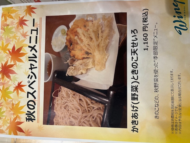 砂場、秋のスペシャルメニューです。野菜かき揚げ(ミニ)としめじ、エノキの天ぷらです。きのこが美味しい季節になりました